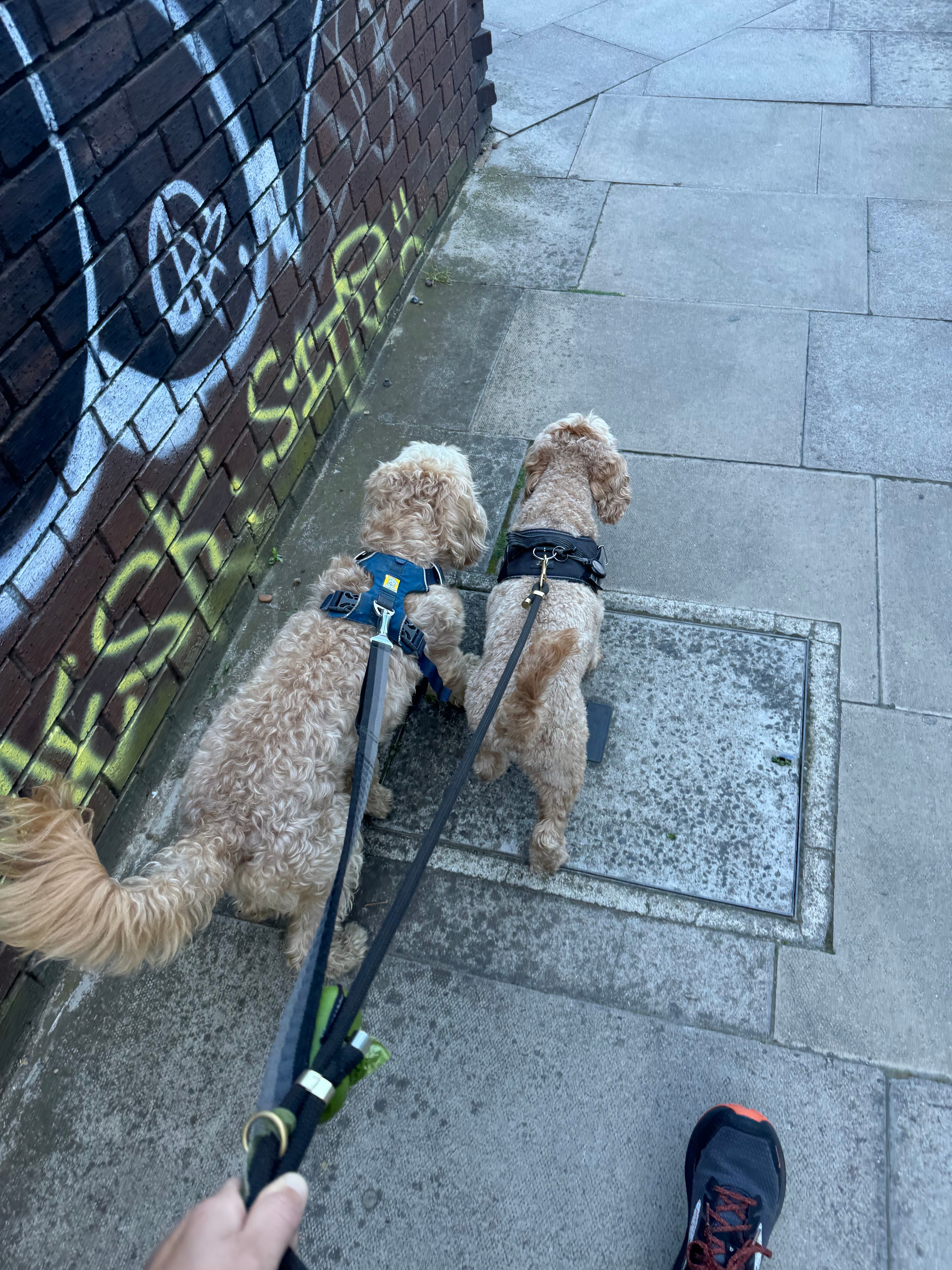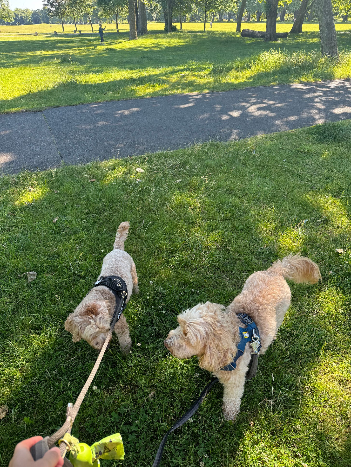 I say goodbye and bring Otto inside the flat, to meet Max. Some mutual sniffing goes on, and Max is characteristically non-plussed. Otto, on the other hand, is giving me anxious dog vibes. He frantically surveys the flat, and acts kind of weird around Max. I think (rather late in the day, in hindsight) that the best thing to do is to take them outside for a long walk, let them burn off some energy, and get to know each other outside. Is there some kind of turf war going on? Let’s hash it out in the park.